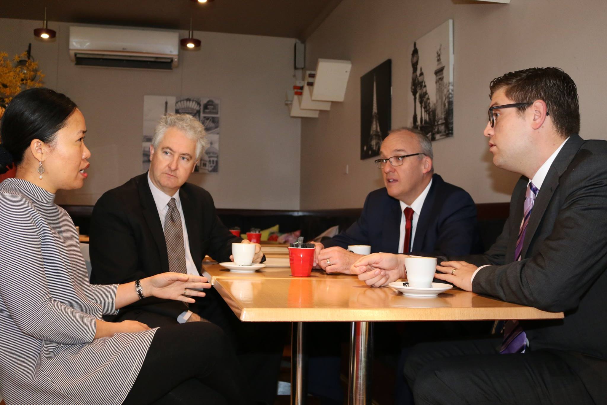 Adam with NSW Labor leader Luke Foley and Ryde Labor’s Jerome Laxale visiting small business owner Quynh at her café in Marsfield to discuss the increasing electricity prices and cost of living pressures at home and at work.